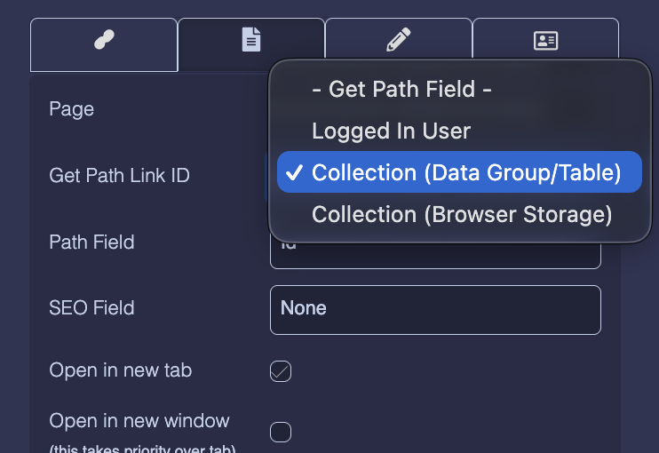 Collection (DataGroup/Table) - It takes the associated collection with the DataGroup/DataTable component and its ID field value for redirection.