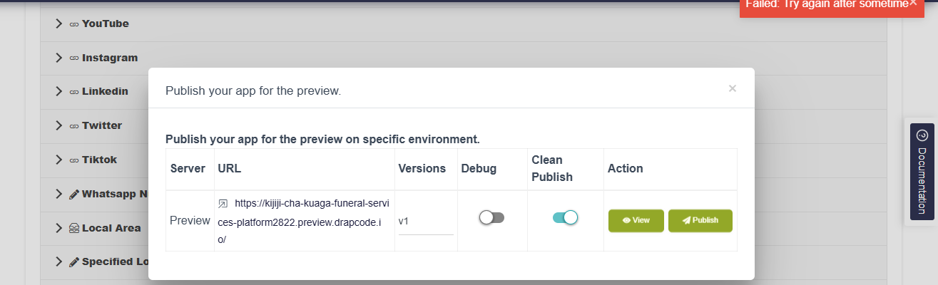 Please help. My app has been showing a message saying publishing has failed and to try again in a short while. initially when I saw this message, the app was actually publishing but now its no longer publishing to reflect any changes.
